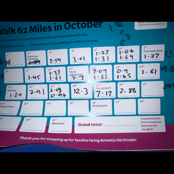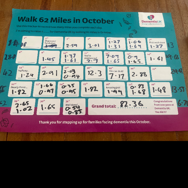 I’m walking 62 Miles in October and raising funds so that families affected by dementia get the specialist help and advice they need. I would be grateful for your support.