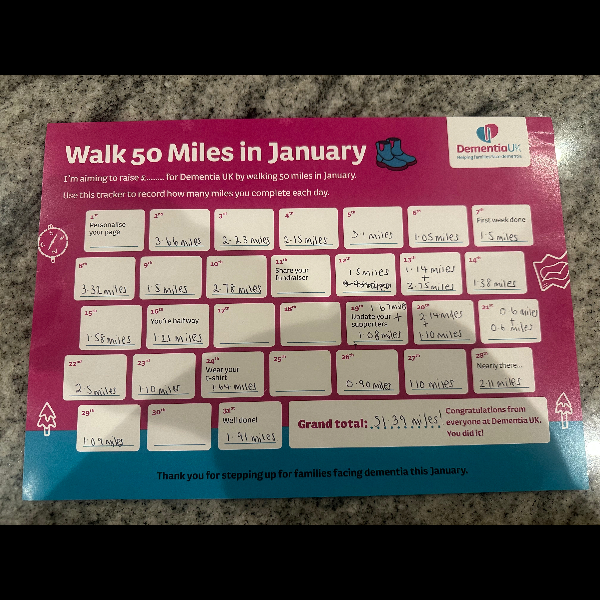 This January, I'm walking 50 Miles and raising funds to help ensure no family faces dementia alone. I'm taking on the challenge for Dementia UK, the specialist dementia nursing charity, and would be grateful for your support.