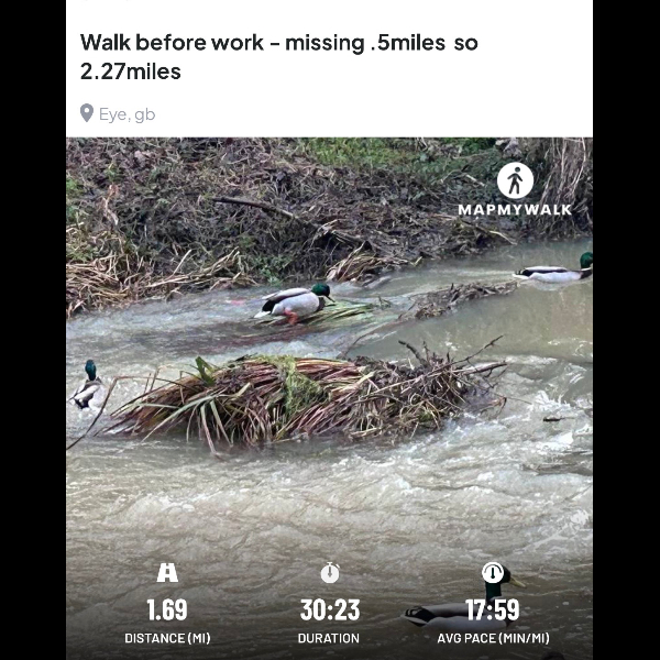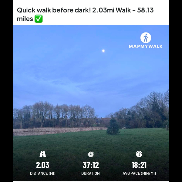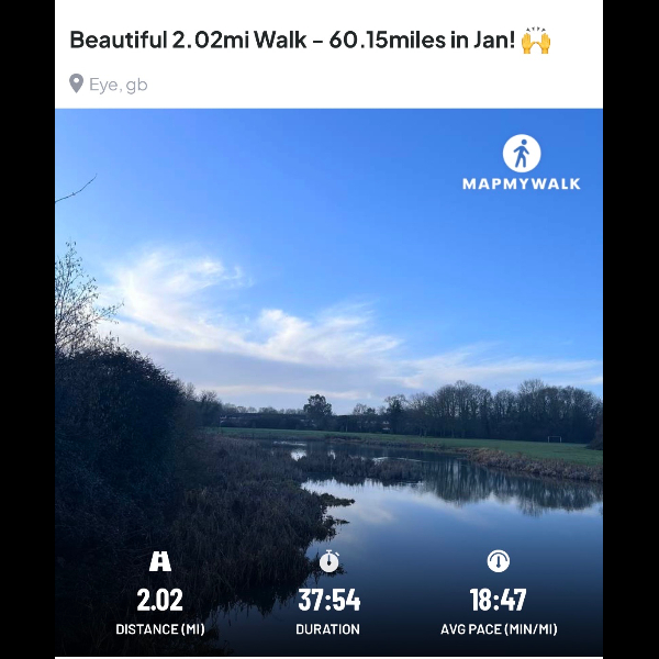 Thursday 1st Jan Started with a 3.38miles walk today, quiet time to reflect on what has happened over the last year.Share