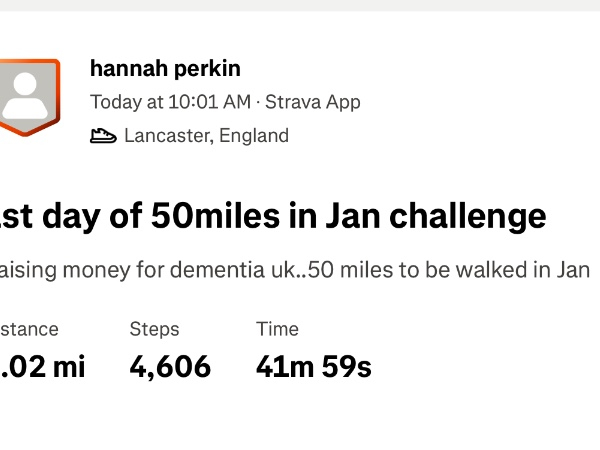 Thursday 1st JanAs we are now in 2026 this will be the first year of our lives without nana Hannah so ….This month I’ve decided to raise money for Dementia UK by walking 50 miles. That might not sound like a huge distance, but for me this challenge is about using the time spent walking as a chance to reflect, remember.