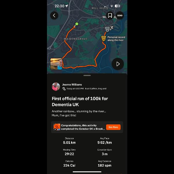 Tuesday 30th Sep This month, I'm walking but will end up running, 62 miles (at least - I want to push myself more this month). If I can achieve my goal and with your donations, it all helps to understanding more about dementia and supporting those who need it.