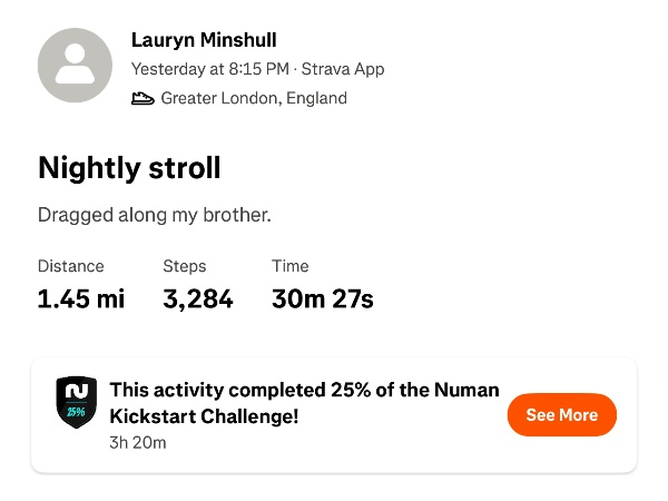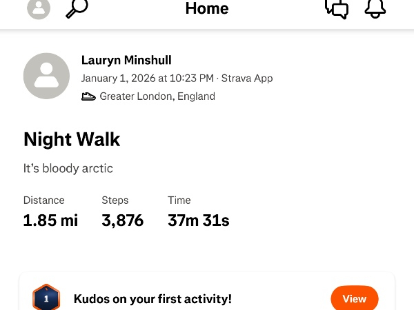 Saturday 3rd Jan Happy new year, so far I’ve walked 3.31 miles, weathers been -5 so been too icy to do more distance but looking forward to a more straight forward walk again today. Tracking all my progress on Strava - Lauryn minshull ✨Thank you to my Sponsors