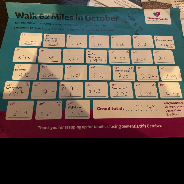I’m walking 62 Miles in October and raising funds so that families affected by dementia get the specialist help and advice they need. I would be grateful for your support.