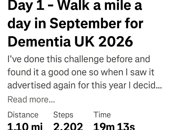 Monday 1st Sep So after my epic fail of signing up to a challenge I should have known I couldn't do last month, I've signed up to one that l now I can do this month. Walk a mile a day in September for Dementia UK.Thank you to my Sponsors
