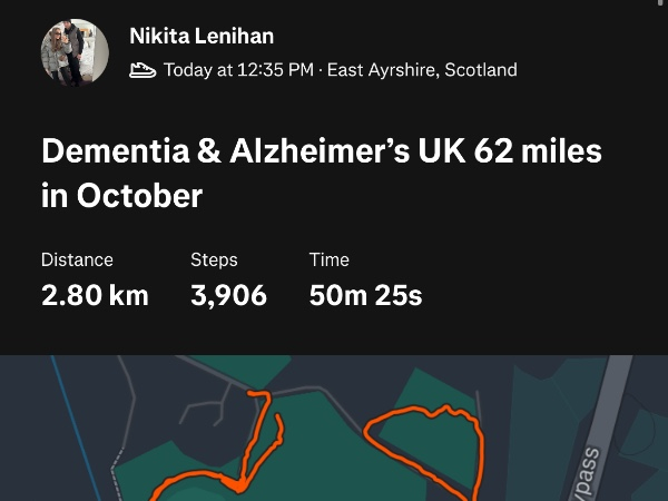 I’m walking 62 Miles in October and raising funds so that families affected by dementia get the specialist help and advice they need. I would be grateful for your support.
