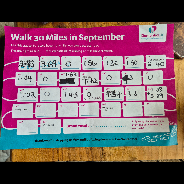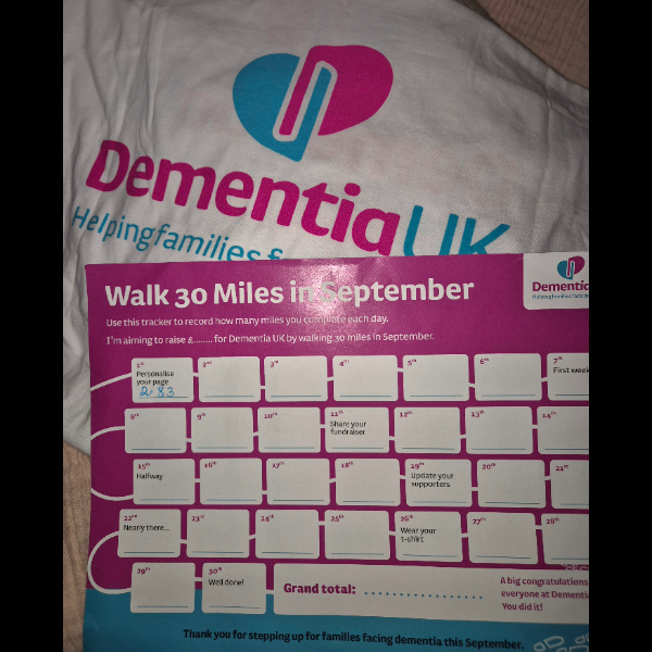 I’m walking 30 Miles in September again for DementiaUK to raise awareness & hopefully some funds too. My partners Dad is living with Dementia/Alzheimers & this is my motivation.