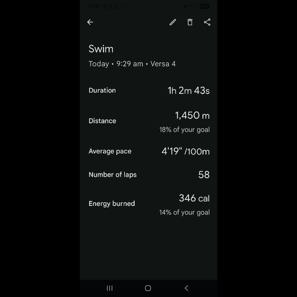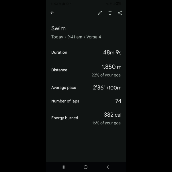 Wednesday 12th Nov My watch quit on me 20 minutes in so I manually counted lengths done in 30 minutes then multiplied by 2 as I was swimming for just short of an hour. I did the calculation based on a round 50 lengths and entered that for today. I'm gutted technology let me down 😭 Share